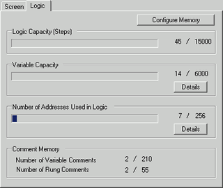 You can check the screen number's current memory usage, or the logic program's current logic capacity, symbol variable capacity, address points, and comment memory. You can change the proportion of the logic capacity and comment memory depending on the use.