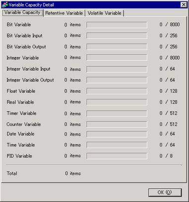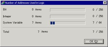 Click this button and the following dialog box appears. The number of points displays on the left side of the indicator for variables and for addresses set up as [Bit Variable], [Integer], or [System Variable]. The number of internal device addresses displays on the right side of the indicator.