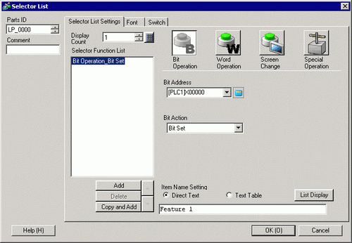 In the selector function list, when you select and right-click the feature and select [Default (D)], the feature will be registered as a switch to be displayed on the top of the list. For the feature to display on the top of the list, it is useful to set the features frequently used as default, because the procedure to select from the list by touch operation is not necessary.