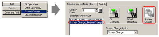 The dialog box will show the screen change settings, and [Screen Change] is added to the [Selector Function List].