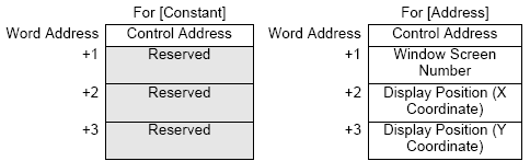 Four consecutive words are used starting from [Window Control Address], the Window Number and position are stored and designated indirectly.