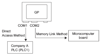 For example, Company A's PLC is connected to COM1 by the direct access method, and the micro-computer board is connected to COM2 by the memory link method.