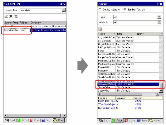 When [Target Item] is [Variable] or [System Variable], double-click the cell in the [Screen Rung/Address] column. This displays the [Address] window and selects the relevant symbol variable or system variable.