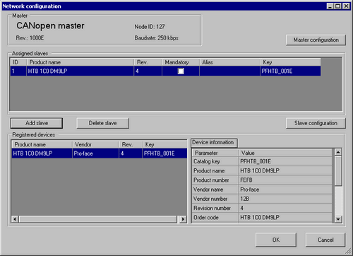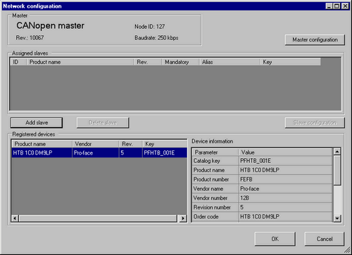 Next, add the HTB (slave) to the CANopen network. In the [EDS List], select the HTB unit's EDS file and click [Add Slave].