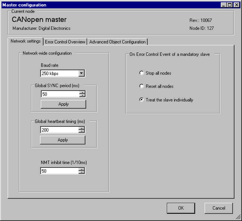 Click [Master Configuration] and the following dialog box appears. Configure all of the CANopen network settings, such as Baud rate, Global SYNC period, and master object settings. Click [OK] to enable the settings and the dialog box closes.