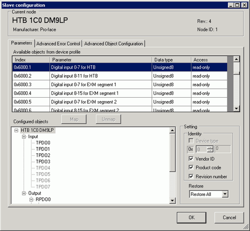 Click [Slave Configuration] with the added slave unit selected and the following dialog box appears. According to the function you want to use, configure the communication parameter settings and set actions and values of objects to be used. Click [OK] to enable the settings and the dialog box closes.