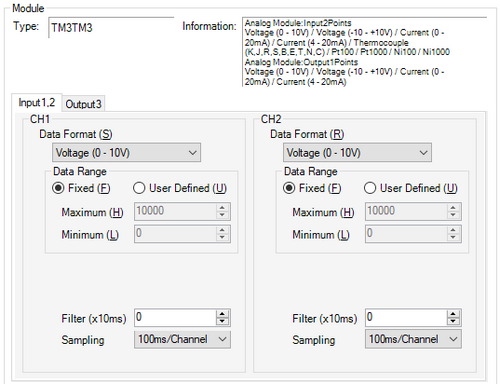 Select the sampling period for calculating the moving average of input values, from [1ms/Channel], [10ms/Channel], and [100ms/Channel]. The available sampling periods depend on the TM3 module used.