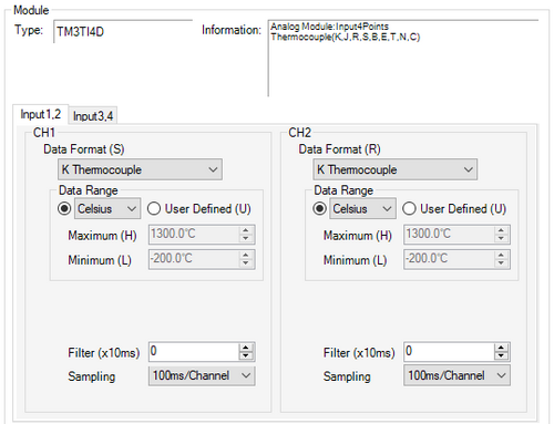 Select the sampling period for calculating the moving average of input values, from [1ms/Channel], [10ms/Channel], and [100ms/Channel]. The available sampling periods depend on the TM3 module used.
