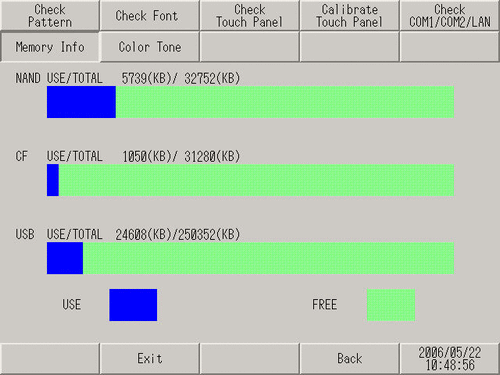 Display the total capacity and used amount of the memory of NAND (area in which the screen data is stored). The histogram shows the used amount in blue and free space in green.