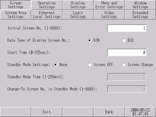 When the [Standby Mode Time] elapses after the last touch screen operation, screen change, alarm banner, or any other message, the screen changes to the screen defined in the [Change-To Screen No in Standby Mode] field.