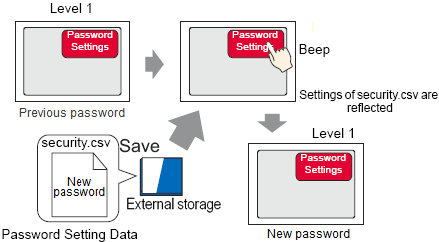 Prepare password setting data in CSV format and save it in external storage. By using a special switch for [Password Settings (File)], at run time you can update security settings by loading password setting data to the display unit.