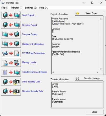 You can also open the same dialog box from GP-Pro EX's [Project (F)] menu by selecting [Transfer Project (G)] and then [Transfer Settings (C)].