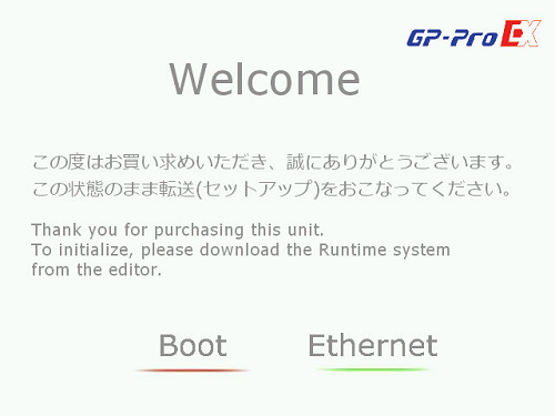 The [Initial Start Mode] screen or the [Welcome] screen is the first screen that appears after turning on the display unit immediately after purchase. After transferring a project once, this screen will not appear.