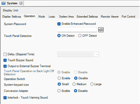 When the [Enable] check box is selected, the display unit accepts inputs from the touch panel or function keys only when the Operation Switch (OP) is pressed.