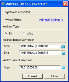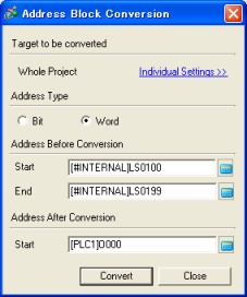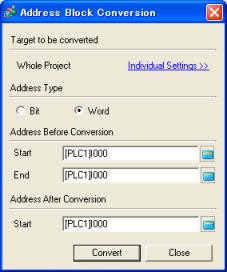 Open the converted project file of GP-Pro EX. On the [Project] menu, select [Utility] - [Convert Addresses] and open the [Address Block Conversion] window.