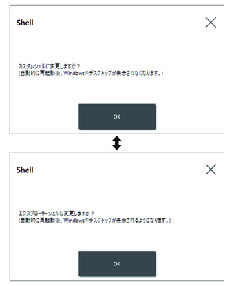 • カスタムシェルに切り替えた場合、エクスプローラーシェルで表示される機能 (Windows® デスクトップ、スタートメニュー、タスクバー等) は使用できません。