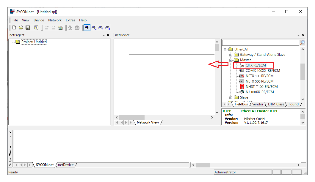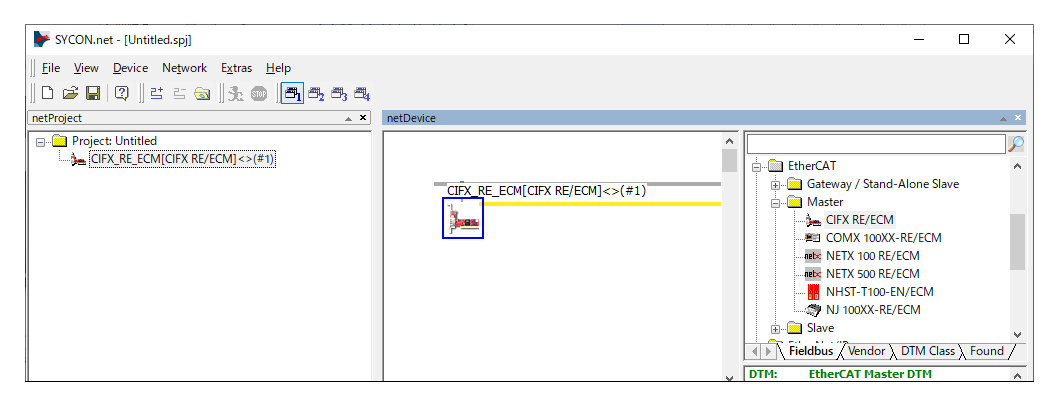 6. In the right-pane of the displayed screen, open EtherCAT > Master, and drag CIFX RE/ECM to the netDevice line.