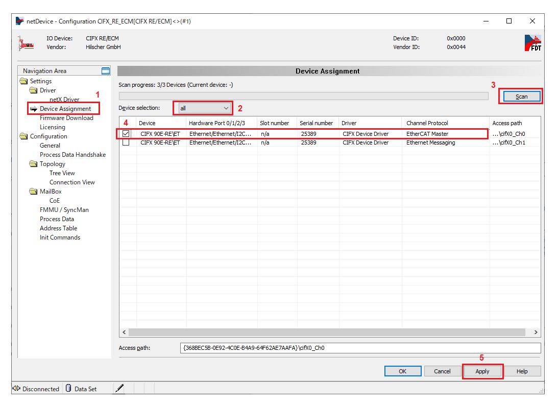 9. Select Settings > Device Assignment. Confirm Device Selection is set to all, and click Scan. In the following, select the applicable items, and click Apply.