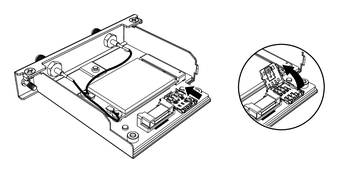 - As shown below, plug the antenna cable connector securely to the connector on the 4G mini PCIe card. Looking from above the interface, plug the able connector on the left side to connector 1, and the cable connector on the right side to connector 2.