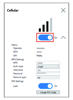 - Configure the APN Settings. As specified by the SIM card provider, enter the APN address, authentication type, user name and password. Select a Network type.