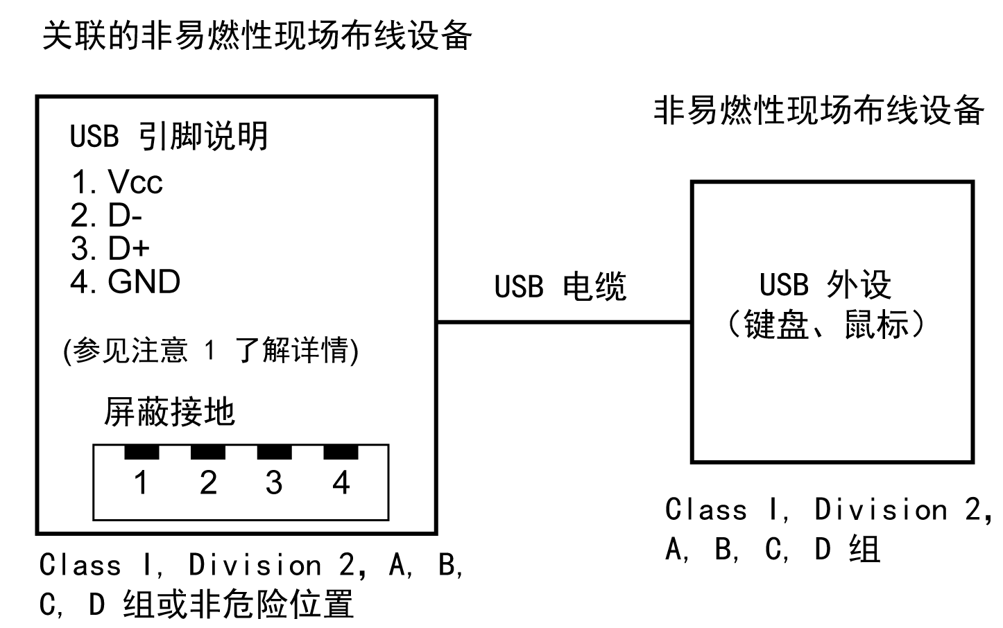 允许将非易燃性现场布线设备 (键盘、鼠标) 用于关联现场布线非易燃性设备 (本产品) 的前置 USB 端口 (A 型)。允许将非易燃性现场布线设备 (本产品)用于关联现场布线非易燃性设备 (计算机)的前置 USB 端口 (Mini B)。