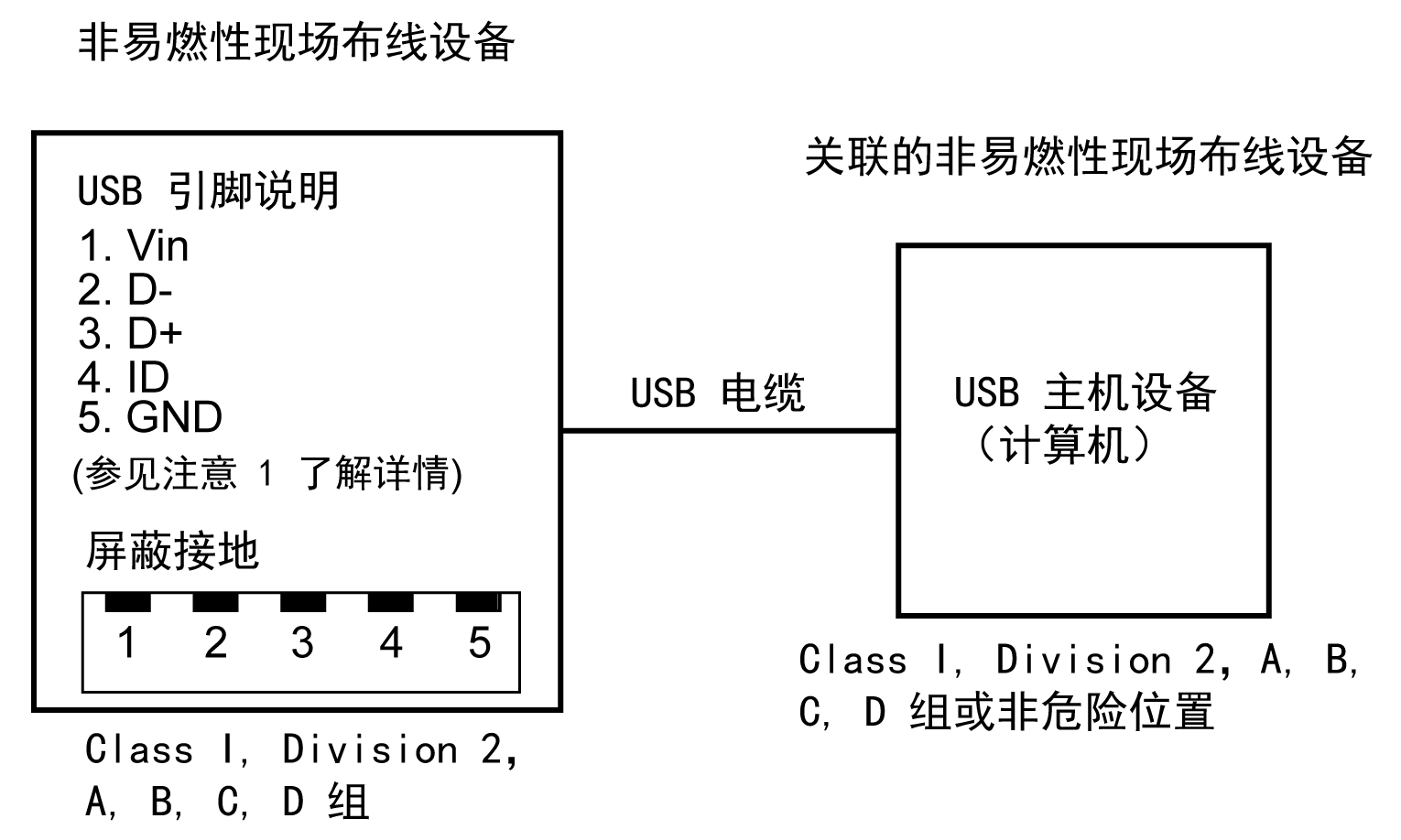 2 区危险环境条例要求所有电缆连接必须有合适的电缆紧固夹和确定的互锁。只使用非易燃性 USB 装置,因为本产品上的 USB 连接没有合适的紧固夹。当线缆的任何一端已通电时,切勿连接或断开线缆。所有通讯电缆应包括机箱接地屏蔽。此屏蔽应包括铜辫和铝箔。D-Sub 型接头外壳必须为金属导体(如压模锌合金),接地屏蔽丝必须直接连接接头外壳。请勿使用屏蔽排扰线。