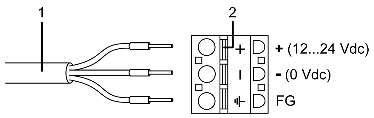 将每线电源线插入到对应的孔内。请松开打开按键将导线固定到位。 1 电源线 2 打开按钮 使用绞合线时,不要与邻近的电线短路。 |