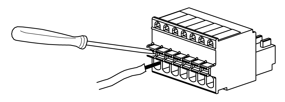 从释放按钮中拉出螺丝刀。电线插入槽随即关闭,电线被固定到位。要拔下电缆,请用平头螺丝刀对准释放按钮的凹槽,在按下按钮的同时拉出电线。 |
