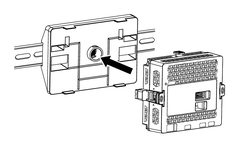 - 将背后模块安装适配器的顶部凹槽放置在 DIN 导轨的顶部边缘。