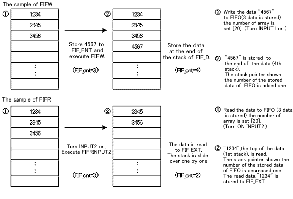 Data are stored moving over in the designated stack every First-in/First-out WRITE. The first stored data are thrown out to the specified register in order by First-in/First-out READ and the stack is closed up.