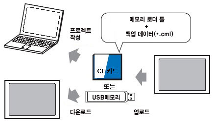 GP내의 프로젝트를 CF 카드에 백업(업로드)하거나 CF 카드 내의 백업 데이터에서 프로젝트를 기동(다운로드)하려면, 전용 툴「메모리 로더 툴」이 CF 카드 내에 저장되어 있어야 합니다. USB 메모리에 백업하는 경우, CF 카드와 다른 USB용 「메모리 로더 툴」을 사용하여 USB 메모리에 저장해 둘 필요가 있습니다. |